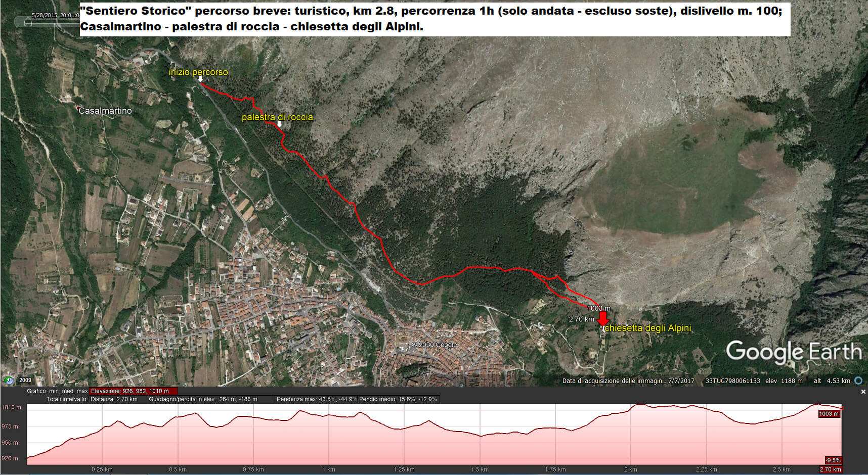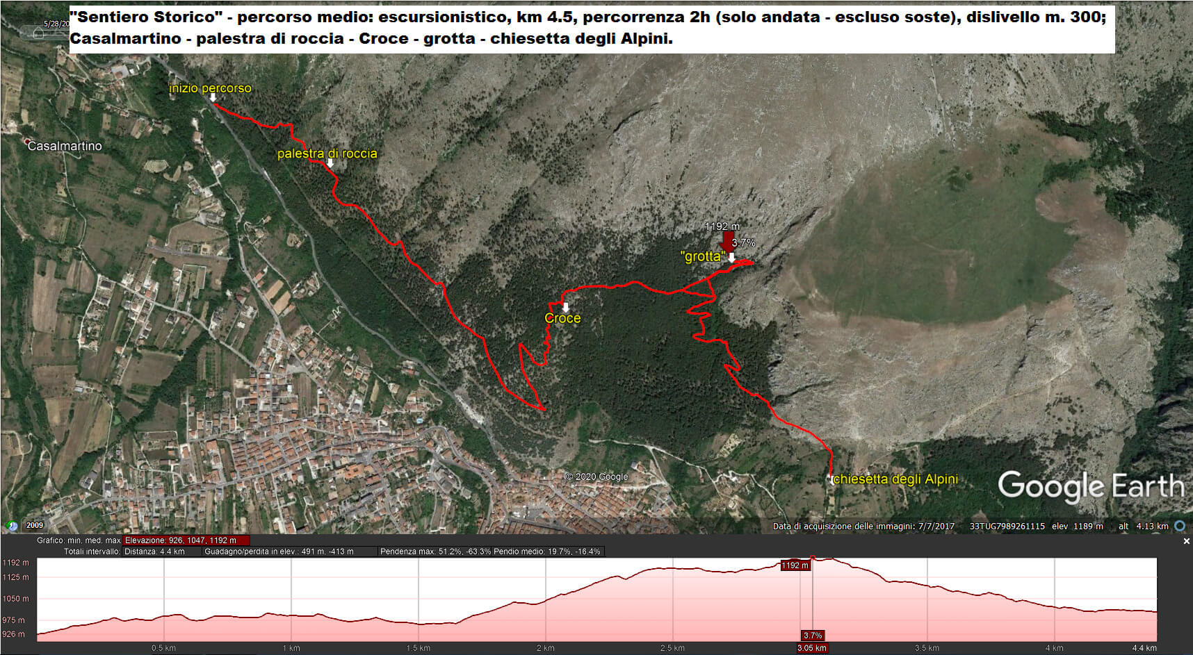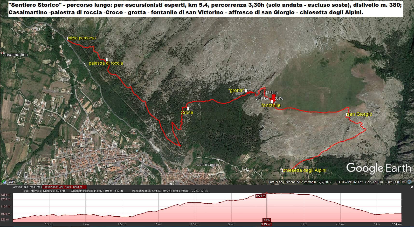 Il sentiero è una passeggiata all'interno del bosco di pina nero austriaco, nel Monte Tino (Serra di Celano), in un mix di colori, profumi e suoni, non molto distante dal centro storico di Celano, ma immersa in una natura selvaggia ed incontaminata. L'itinerario si sviluppa su tre percorsi, breve, medio e lungo, distinti dal coefficiente di difficoltà. Partenza ed arrivo sono segnati da una bacheca in legno con descrizione naturalistica e storica relativa all'escursione. A qualche minuto dall'imbocco del sentiero storica di Celana ci si può soffermare in una prima area di sosta per ammirare una parete rocciosa attrezzata dove è possibile cimentarsi nell'arrampicata sportiva.