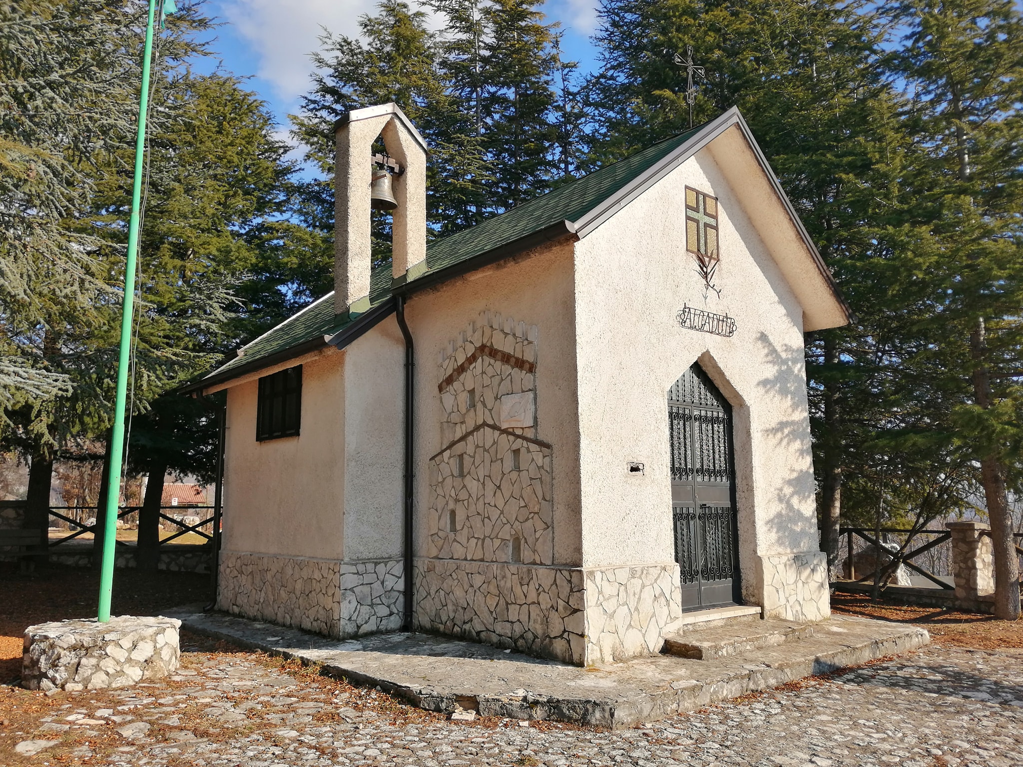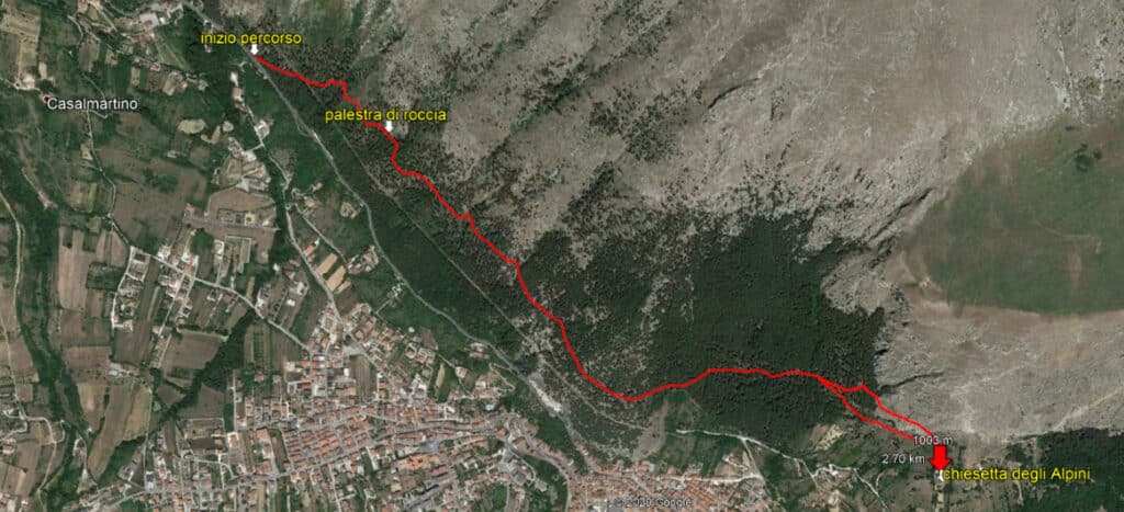 Qui dove un tempo era la torre del castello recinto dell'antica Celano, oggi c'è una croce in ferro eretta dai Celanesi all'inizio del secolo a memoria dell'antico splendore. Si continua salendo brevemente prima di riprendere il comodo sentiero che a zig-zag conduce, sempre attraverso la pineta, alla Chiesetta degli Alpini. L'itinerario, semplice ma mai noioso, è ben segnalato dalla vernice bianco-rossa altre che da tabelle in legno incise a mano da un socio artigiano. Quasi ad evocare il cammino mistico di Santiago di Compostela, di tanto in tanto si trovano sulla roccia, mattonelle in terracotta raffiguranti San Giorgio sul cavallo bianco armato di lancia, nell'atto di ferire il drago.