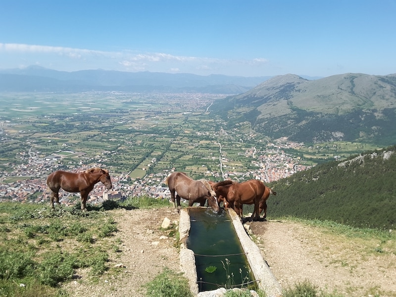 Qui il percorso si fa sempre più ripido, con una serie di stretti "tomanti" che ben presto ci presentano alla vista l'ampia pianura del Fucino, incastonata dai piccoli Comuni marsicani ed incoronata dalle cime levigate del Medio Appennino Abruzzese. Fra tutte, la Serra di Celano (Monte Tino 1923 m.), la più vicina, che svetta alla spalle.
