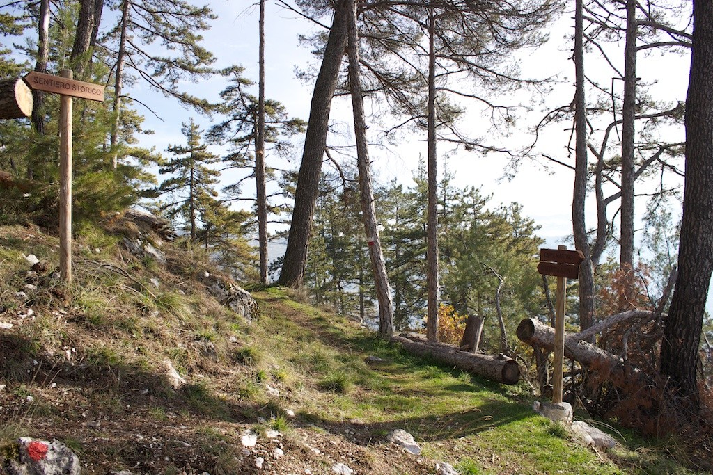 Proseguendo lungo il dolce saliscendi del sentiero, si possono notare i resti delle fortificazioni murarie a protezione dell'incastellamento dell'antica Celano medievale distrutta nel 1223 dall'imperatore Federico II di Svevia, fino a raggiungere la seconda area di sosta, su di un piccolo terrazzamento proprio in corrispondenza della biforcazione del sentiero. Da qui, ammirando il paesaggio verso la Piana del Fucino, si nota il maestoso Castello Piccolomini di Celano e, più a valle, l'intera abitato cittadino. Si può quindi scegliere il sentiero di destra che ridiscende gradualmente fino alla cosiddetta Chiesetta degli Alpini(punto di arrivo dei 3 percorsi), oppure prendere a sinistra ed affrontare la salita che porta ai resti dell'antica Celano.