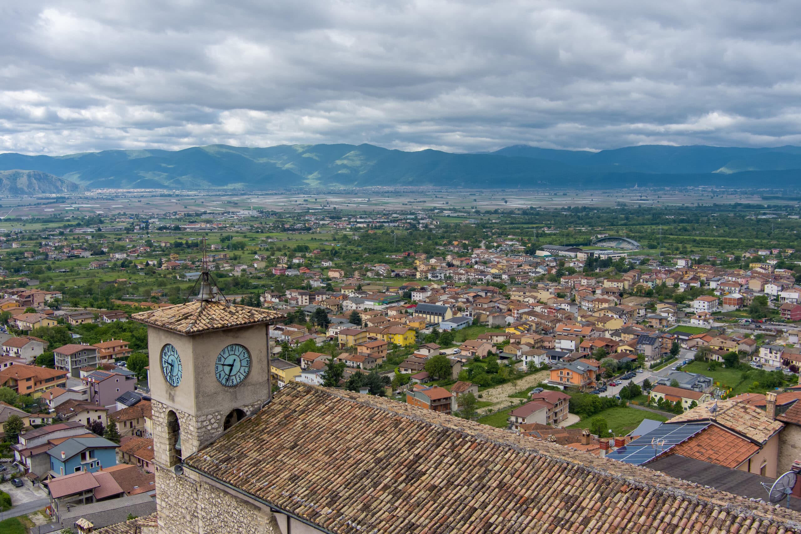 Il portale strombato, in marmi policromi, fu realizzato dalle stesse maestranze aquilane che operarono nelle chiese di San Giovanni e di Sant'Angelo; l'affresco sulla lunetta, raffigurante “Madonna con bambino fra San Francesco d'Assisi e Sant'Antonio da Padova” è attribuito al “Maestro del 1465” , un artista della cerchia di Andrea De Litio.