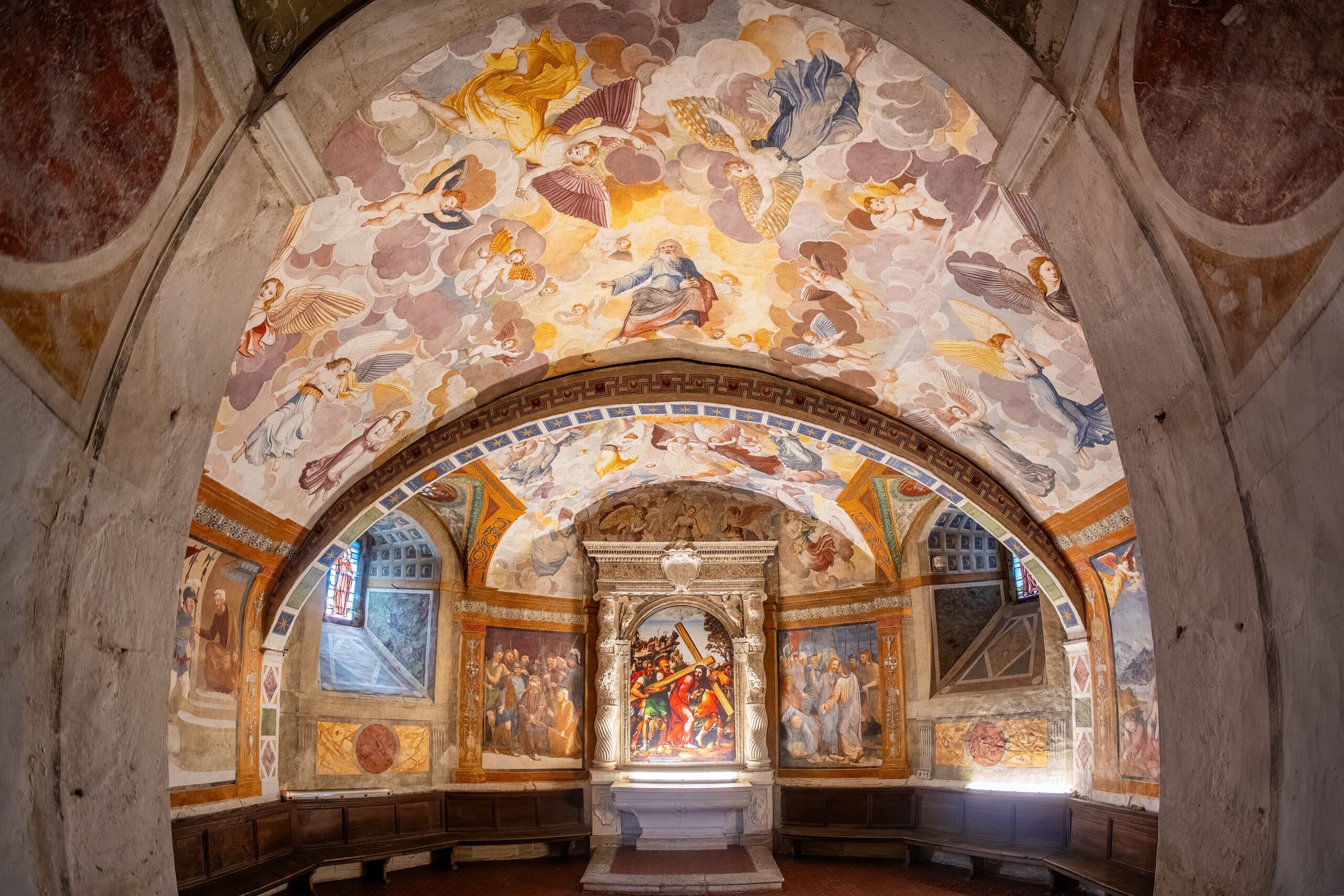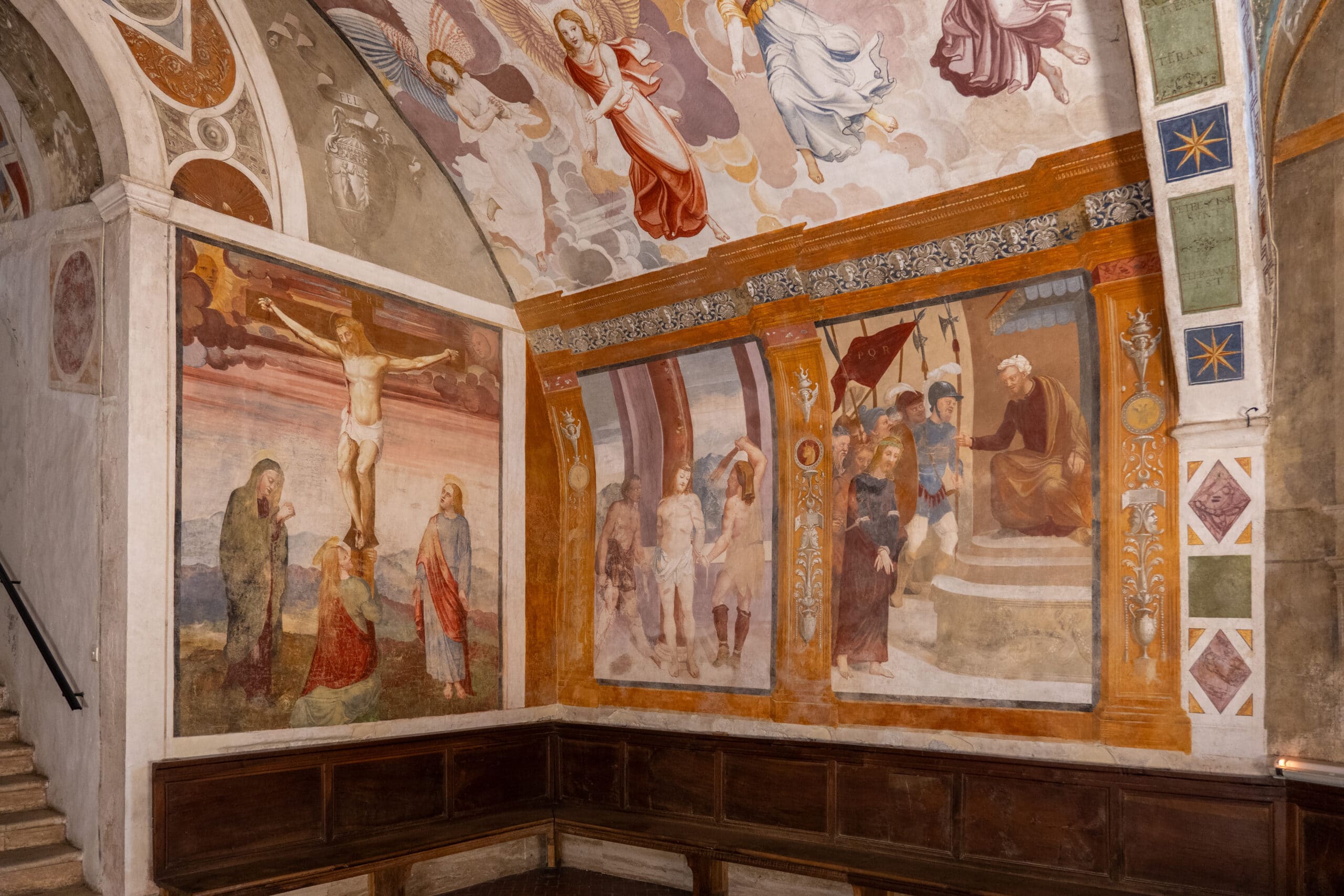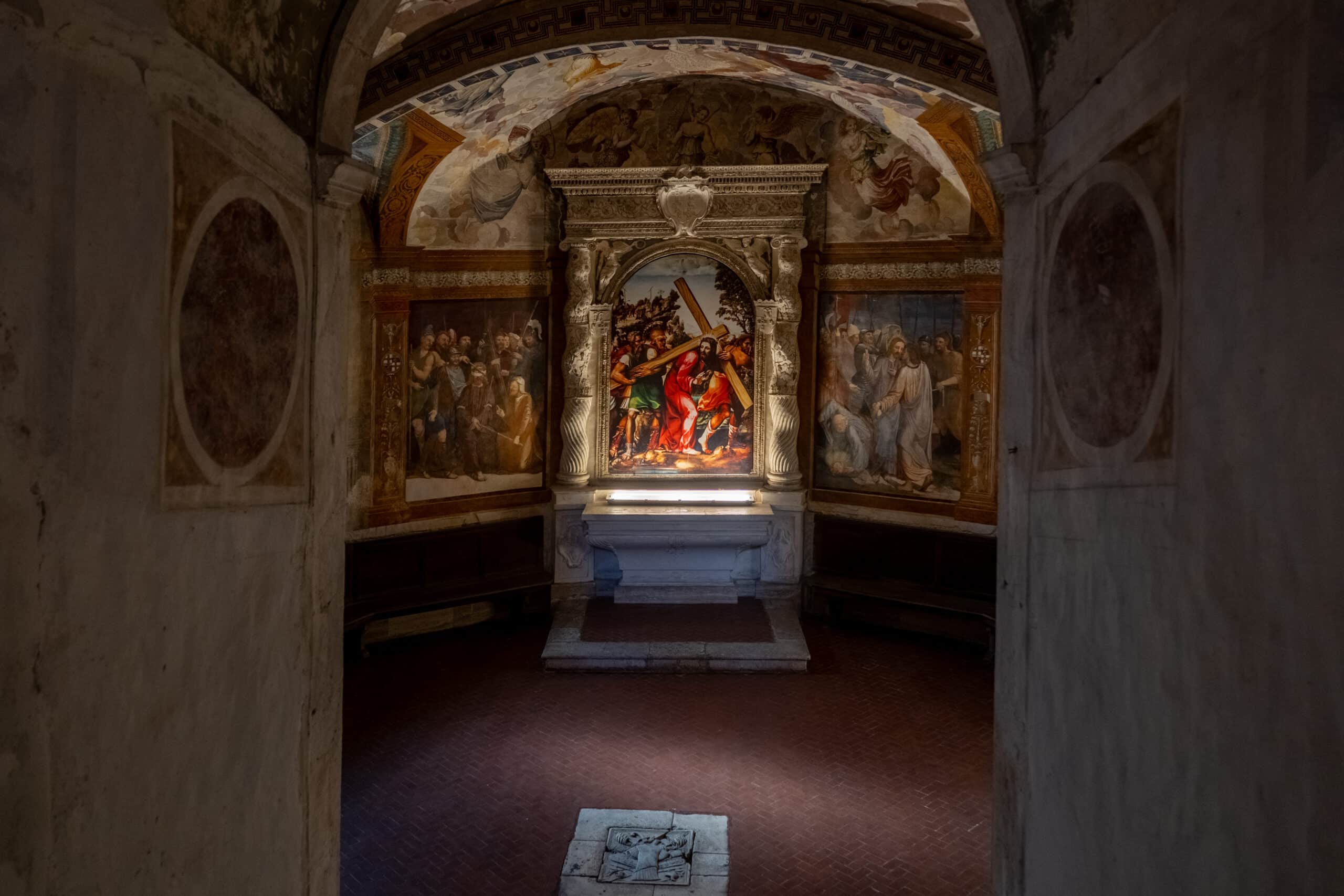 All'altezza del presbiterio una scala centrale con balaustre rinascimentali immette nella sottostante cripta, detta “Paradiso”, per la decorazione della volta che raffigura una schiera di angeli e putti. L'ingresso alla cappella è delimitato da un arco con stemmi dei sovrani d'Aragona-Castiglia e dei conti Piccolomini-Silveri, ambedue sormontati dall'aquila imperiale di Carlo V.