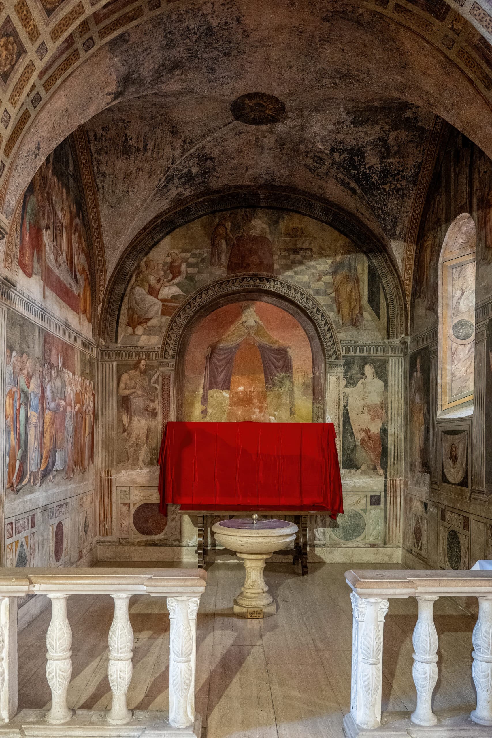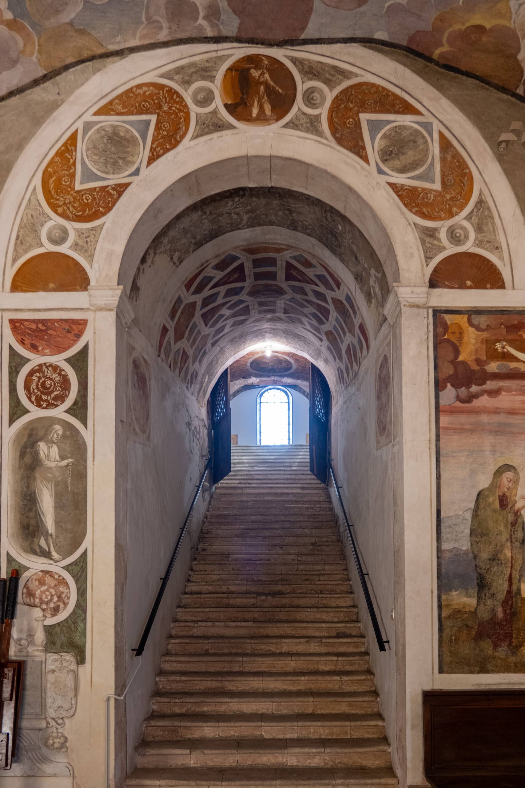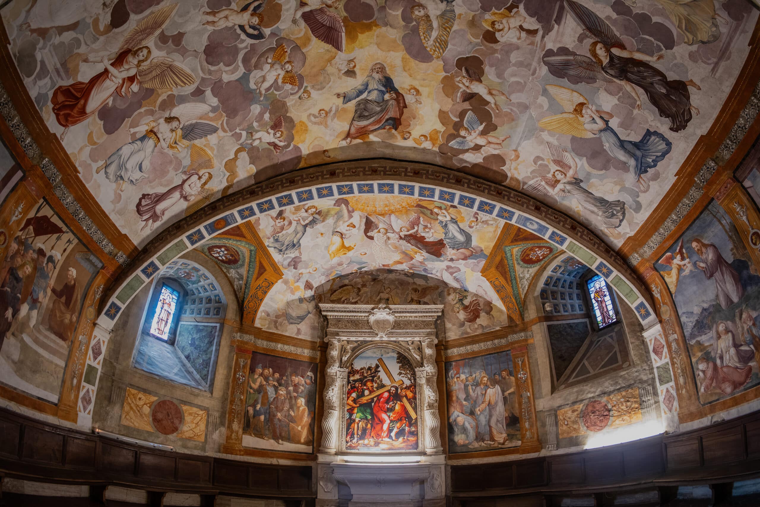 All'altezza del presbiterio una scala centrale con balaustre rinascimentali immette nella sottostante cripta, detta “Paradiso”, per la decorazione della volta che raffigura una schiera di angeli e putti. L'ingresso alla cappella è delimitato da un arco con stemmi dei sovrani d'Aragona-Castiglia e dei conti Piccolomini-Silveri, ambedue sormontati dall'aquila imperiale di Carlo V.
