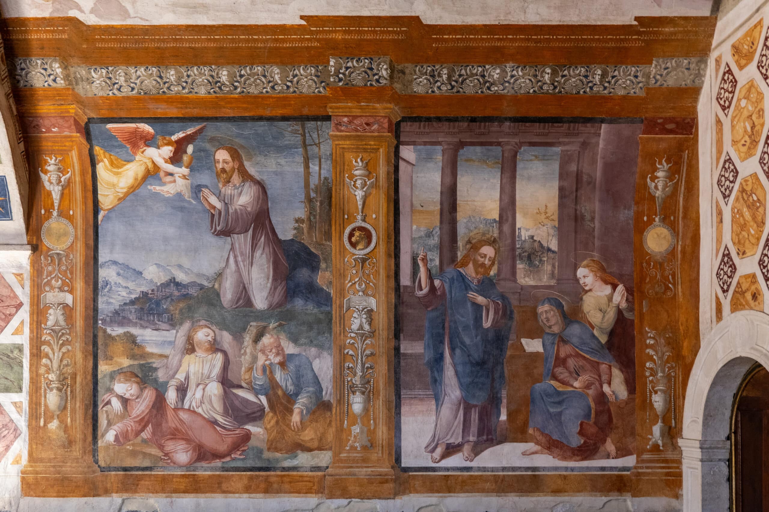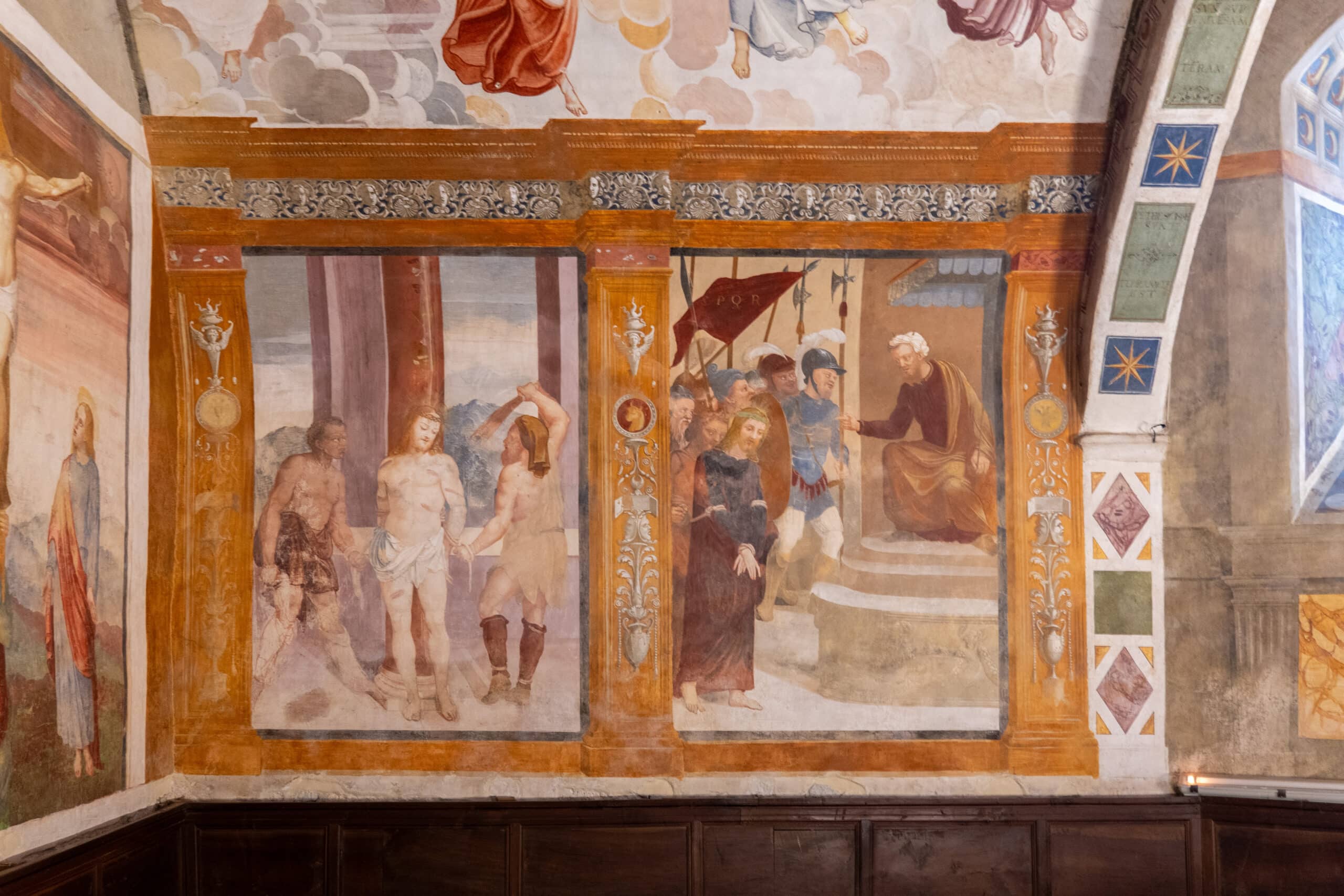 L'interno ad unica navata presenta sul lato sinistro tre cappelle ornate di pregevoli affreschi e sulla parete destra due grandi pale d'altare: una raffinata Natività, realizzata nei primi decenni del XVI secolo da un ignoto pittore umbro-senese e “Gesù e il Cireneo” (o “Andata al Calvario”), datata 1525-1530 ed attribuita a Giovanni Antonio Bozzi detto il Sodoma.